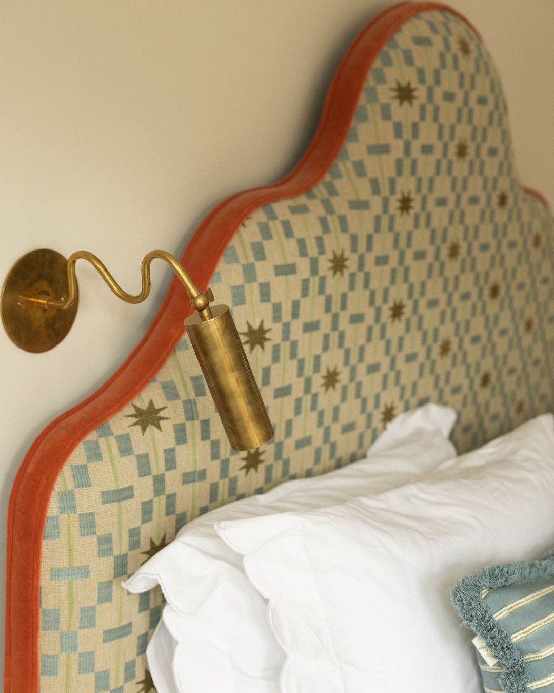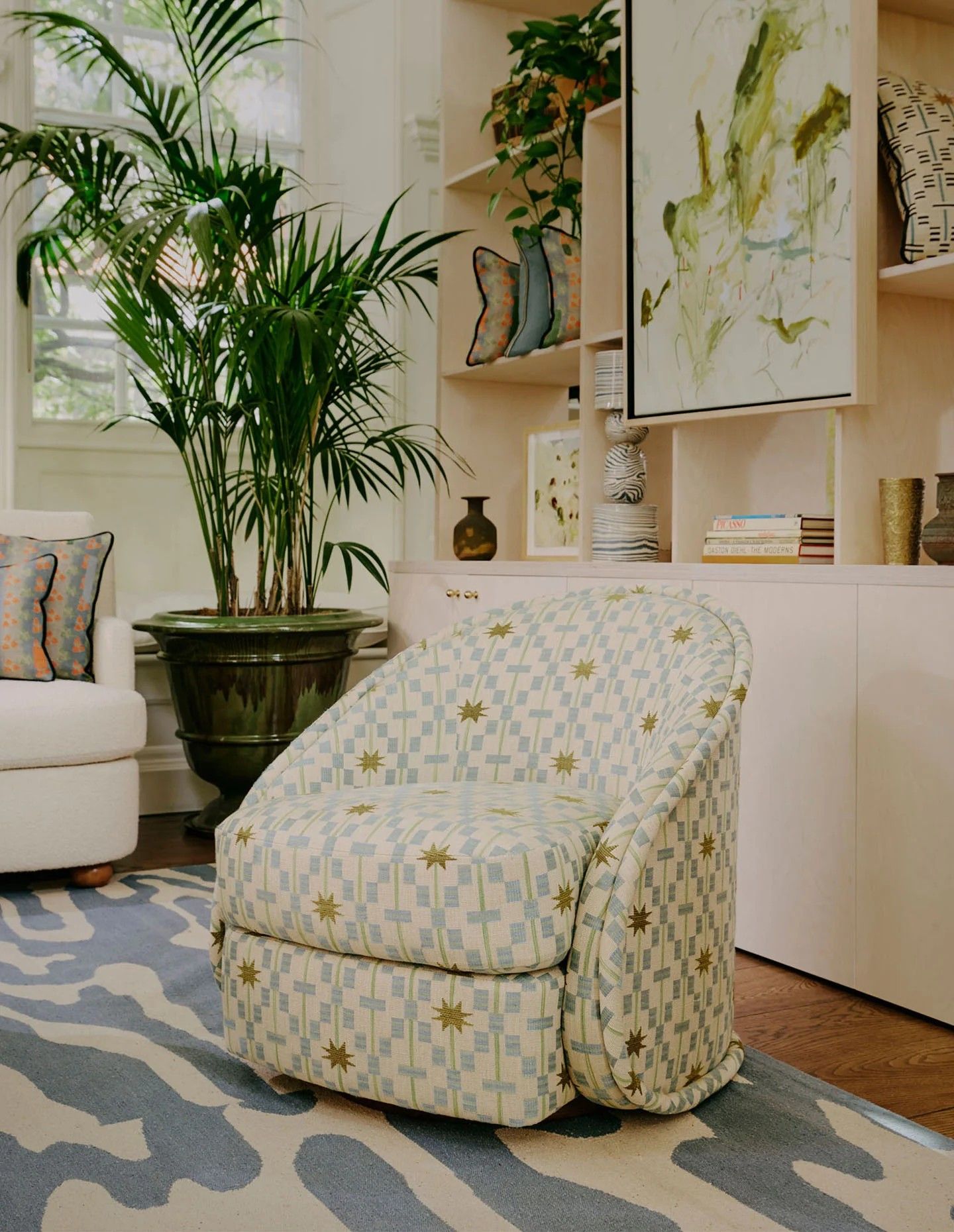 From upholstered armchairs and statement headboards to layered cushion arrangements and window treatments, the fabric brings structure and personality to a space. Its bold geometry works particularly well when paired with softer textures such as bouclé or mohair, creating balanced and visually rich schemes.