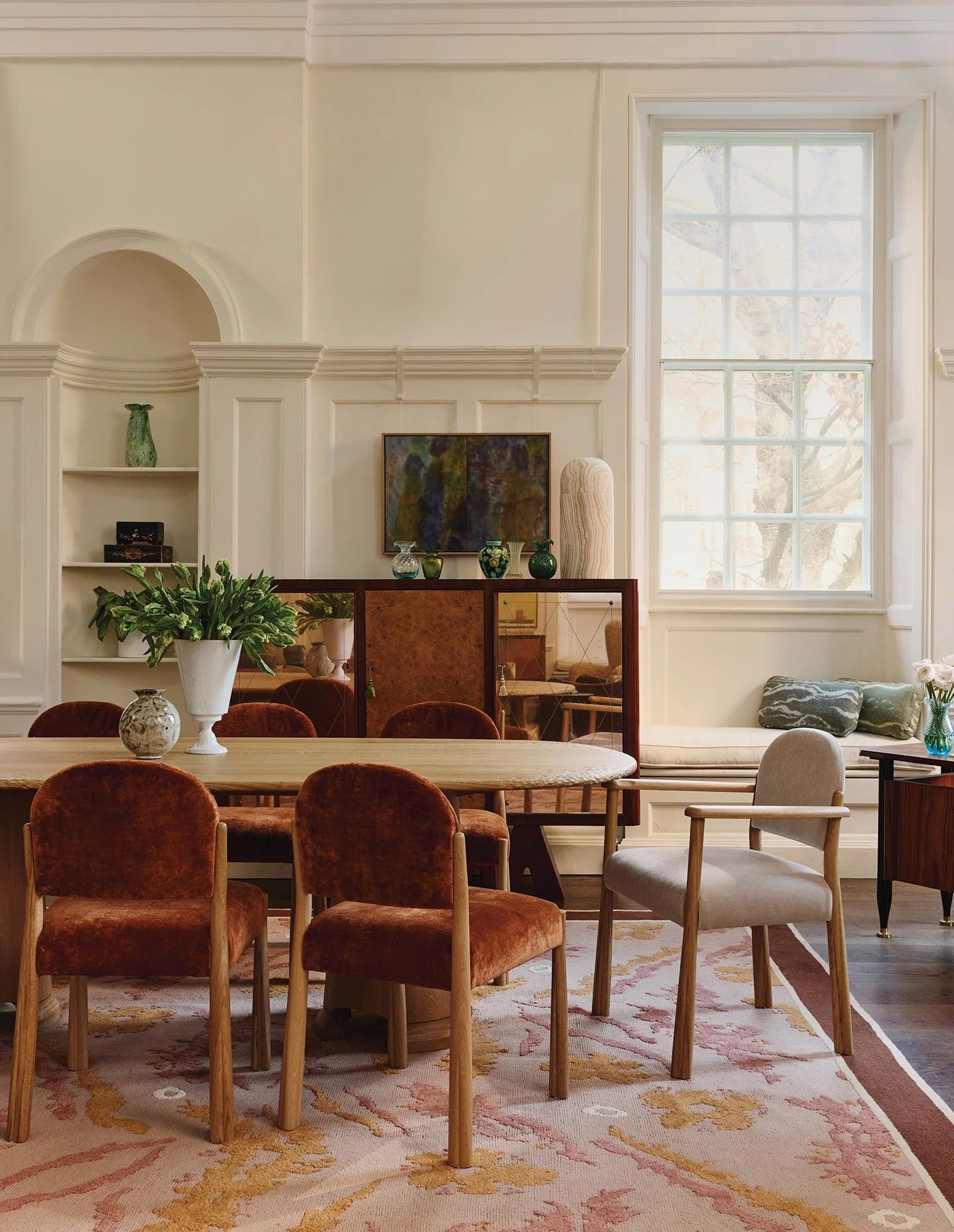 I also love antique rugs, but in modern spaces rooms often call for something square, which usually means having one made. That’s a process I really enjoy — selecting yarns, working out colour distribution, and thinking about pattern and scale.