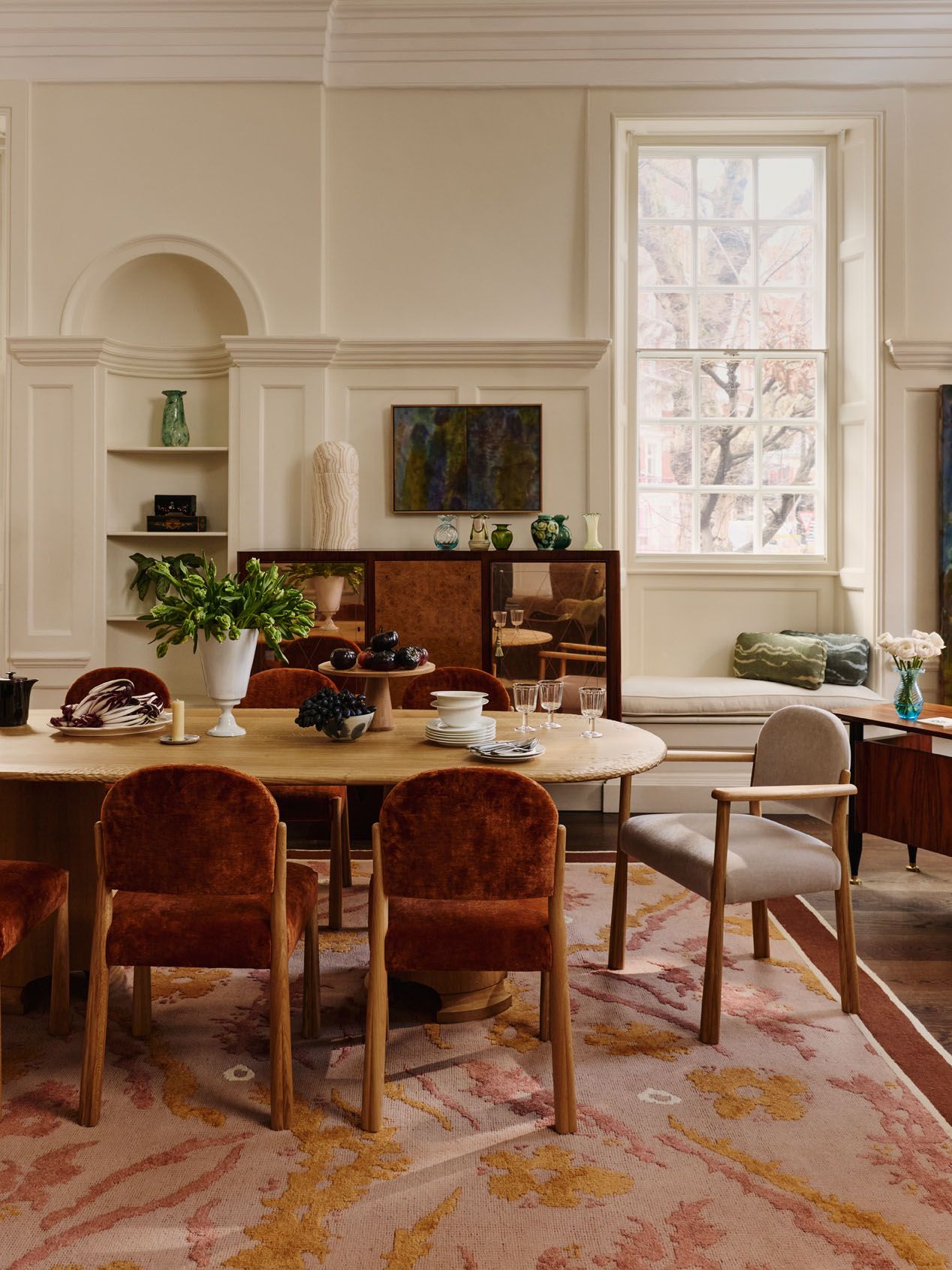 This balance can be achieved through scale — a richly coloured sofa offset with lighter cushions, or a patterned rug grounded by simpler textiles around it.